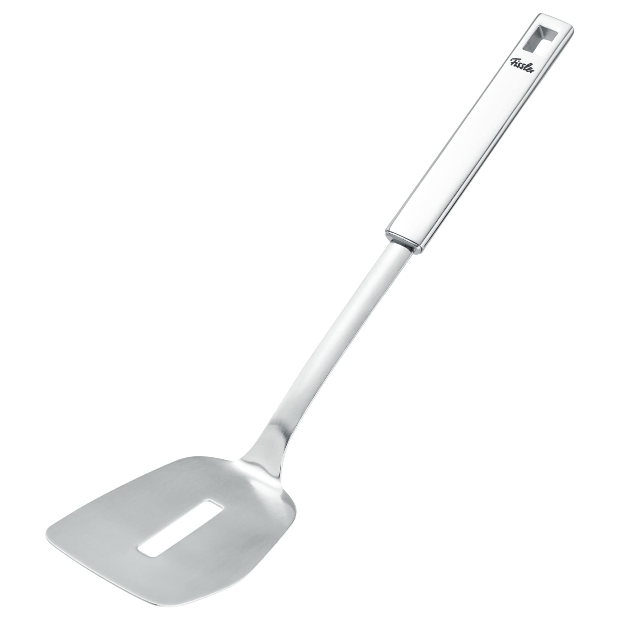 - Contains: 1x Fissler Fry Pan Metal Turner with slot, polished Stainless Steel with convenient hanging eyelet, ideal for uncoated fry pans