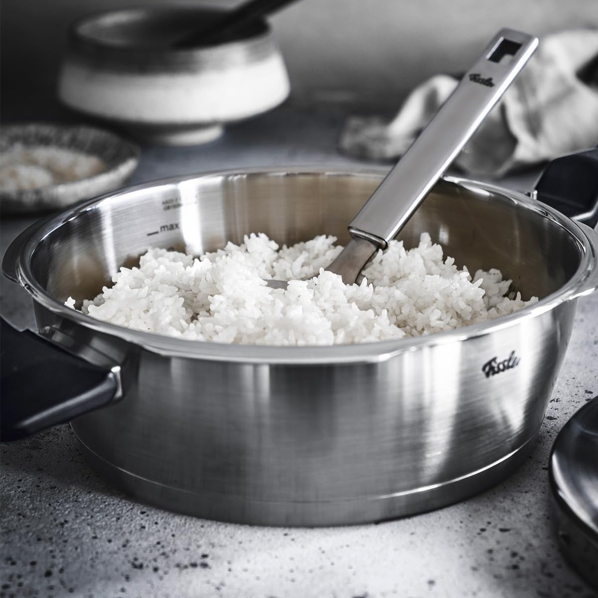 - BUILT TO LAST, EASY TO USE, AND VERSATILE: Features Fissler’s Novogrill surface for low-fat searing, rivet-free construction for quick cleanup, and interior measurement markings. Works on all stovetops, including induction. Built with a 10-year warranty. Dishwasher safe (except for removable parts).